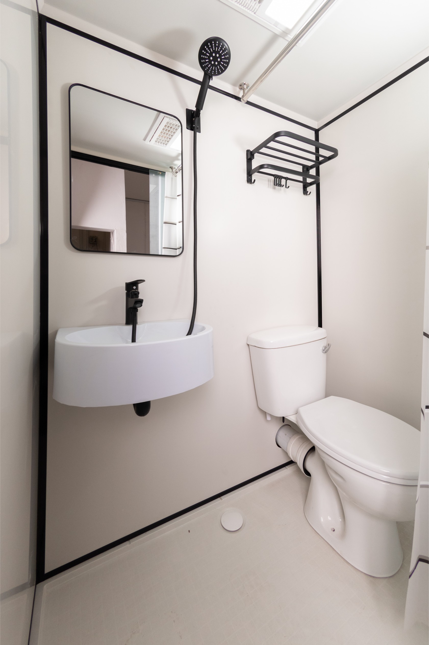 Built with UV waterproof materials, a high-strength aluminum frame, and a fibreglass base reinforced with steel legs (up to 400kg), this cabin is made to last. It includes modern finishes such as a brass black mixer tap, tempered glass sliding door, LED lighting with exhaust fan, and a sleek black storage shelf for convenience.