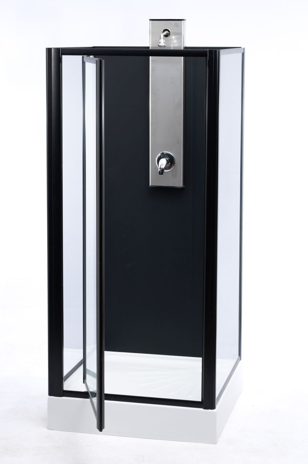- 2 x Hardened black framed glass return panels and an aluminum pivot door (SABS approved)